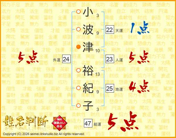 小波津裕紀子さんの総運は47画の5点!