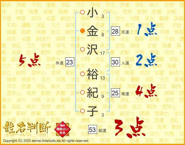 小(3画)金(8画)沢(17画) 裕(13画)紀(9画)子(3画)