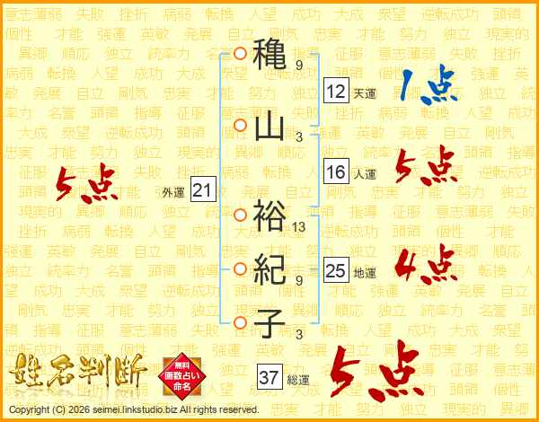 穐(9画)山(3画) 裕(13画)紀(9画)子(3画)