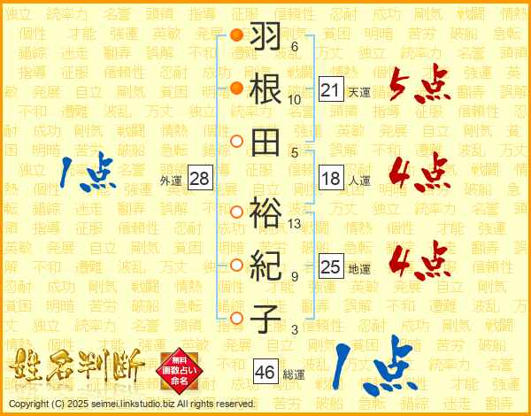 羽(6画)根(10画)田(5画) 裕(13画)紀(9画)子(3画)