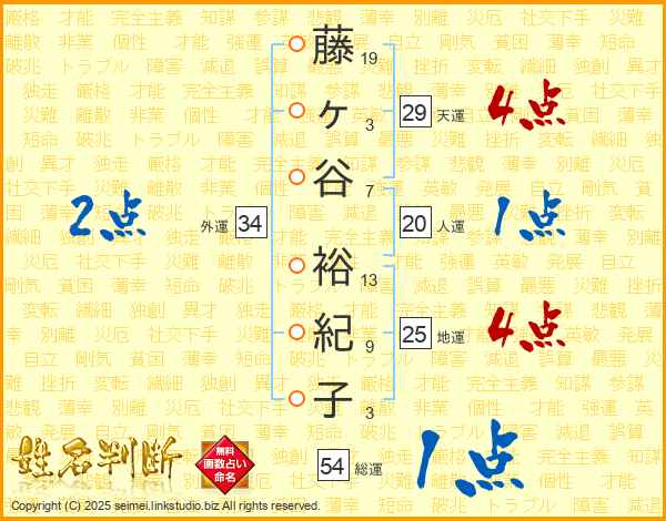 藤ヶ谷裕紀子さんの総運は54画の1点!