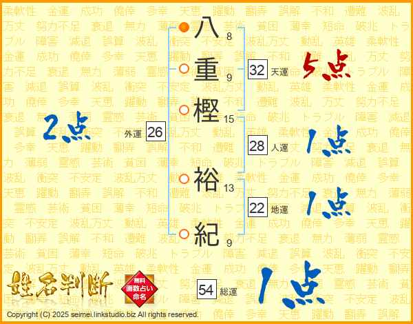 八(8画)重(9画)樫(15画) 裕(13画)紀(9画)