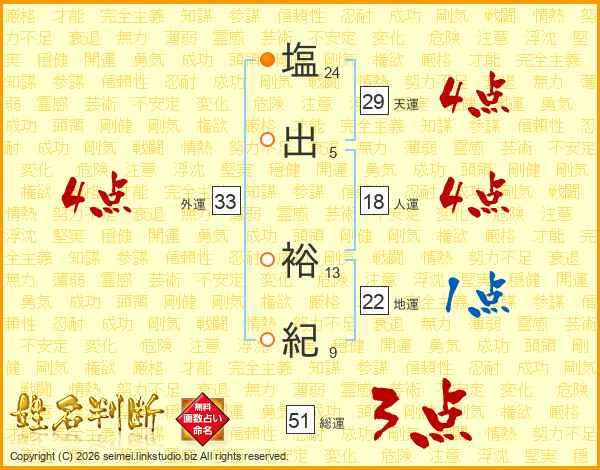 塩(24画)出(5画) 裕(13画)紀(9画)