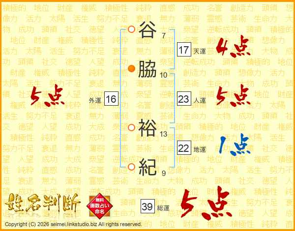 谷脇裕紀さんの総運は39画の5点!