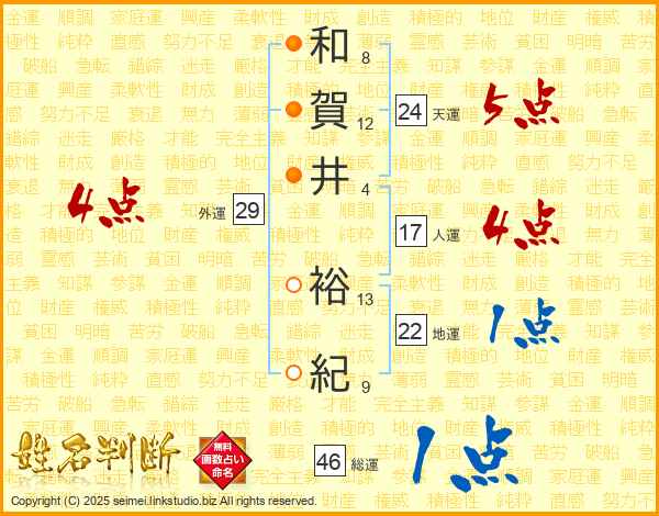 和賀井裕紀さんの総運は46画の1点!