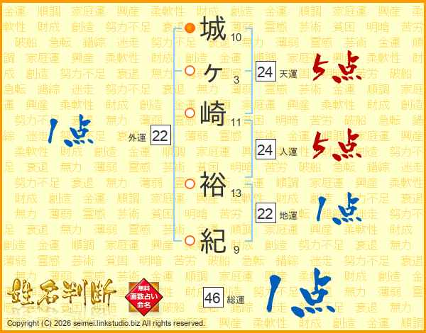 城(10画)ヶ(3画)崎(11画) 裕(13画)紀(9画)