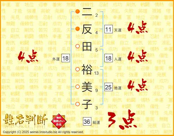 生活面を象徴する運勢です。外部から受ける影響力を表し、結婚運、家庭運や職場、環境への順応性を表します。総運から人運を引いた画数。姓や名が1文字の場合を除く。