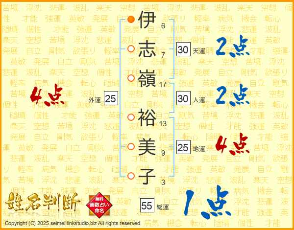 伊(6画)志(7画)嶺(17画) 裕(13画)美(9画)子(3画)