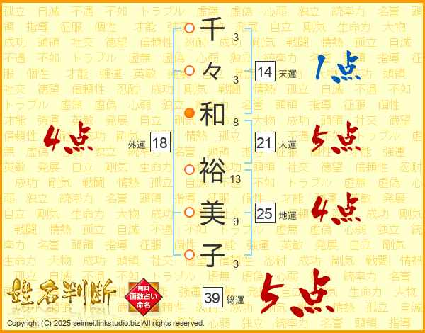 千(3画)々(3画)和(8画) 裕(13画)美(9画)子(3画)