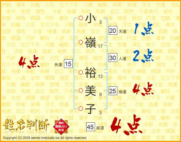 小(3画)嶺(17画) 裕(13画)美(9画)子(3画)