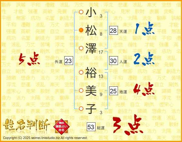 小(3画)松(8画)澤(17画) 裕(13画)美(9画)子(3画)