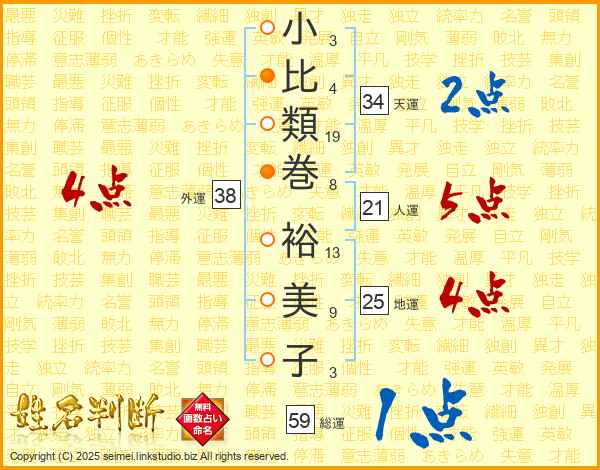 小(3画)比(4画)類(19画)巻(8画) 裕(13画)美(9画)子(3画)