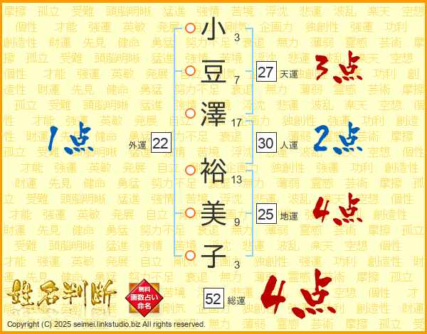 小(3画)豆(7画)澤(17画) 裕(13画)美(9画)子(3画)