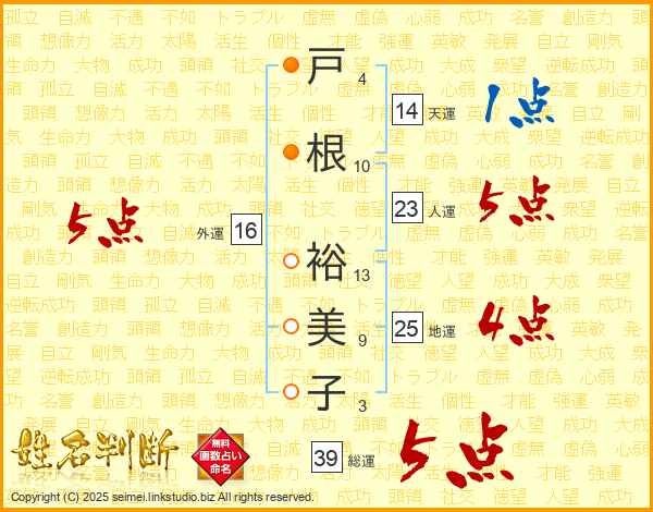 戸(4画)根(10画) 裕(13画)美(9画)子(3画)