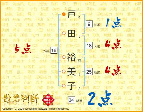 戸(4画)田(5画) 裕(13画)美(9画)子(3画)