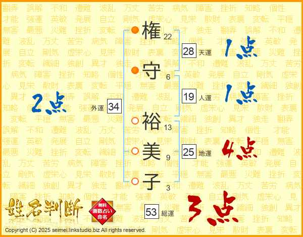 権(22画)守(6画) 裕(13画)美(9画)子(3画)