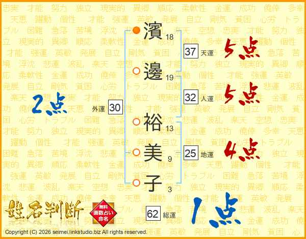 濱(18画)邊(19画) 裕(13画)美(9画)子(3画)