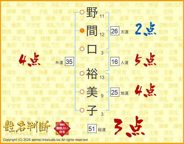 野間口裕美子さんの外運は35画の4点!