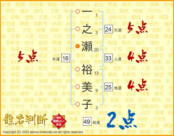 一(1画)之(3画)瀬(20画) 裕(13画)美(9画)子(3画)