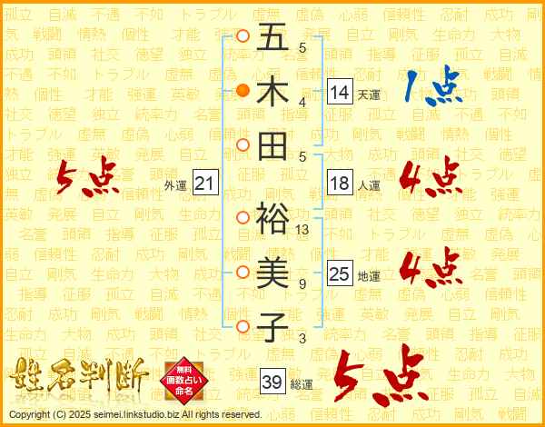 五(5画)木(4画)田(5画) 裕(13画)美(9画)子(3画)