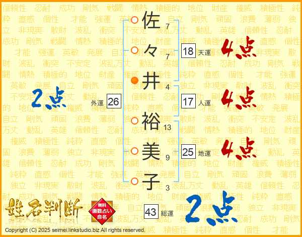 佐々井裕美子さんの総運は43画の2点!