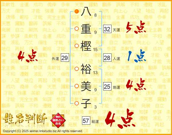 八(8画)重(9画)樫(15画) 裕(13画)美(9画)子(3画)