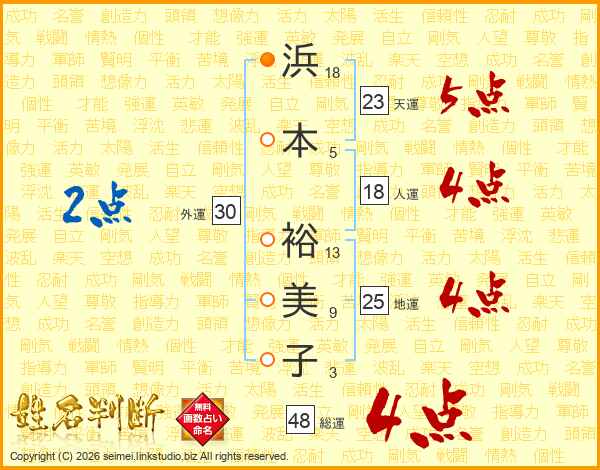 浜(18画)本(5画) 裕(13画)美(9画)子(3画)