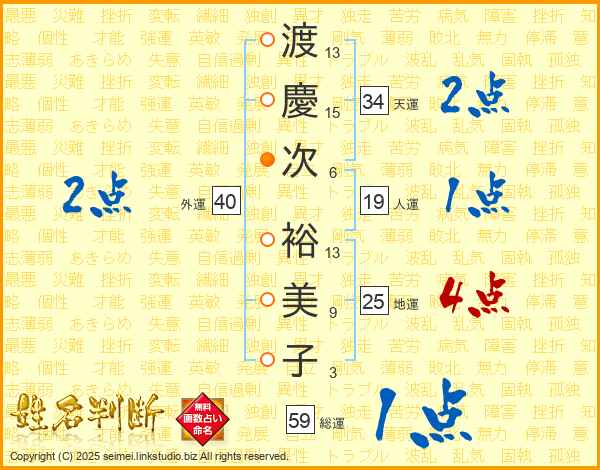 渡(13画)慶(15画)次(6画) 裕(13画)美(9画)子(3画)