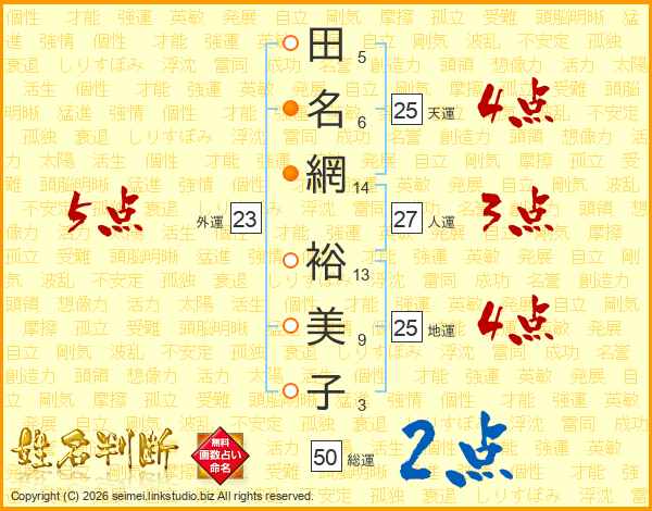 田(5画)名(6画)網(14画) 裕(13画)美(9画)子(3画)