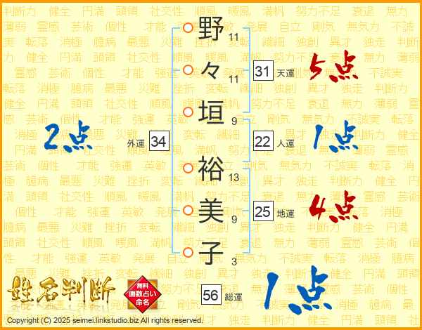 野(11画)々(11画)垣(9画) 裕(13画)美(9画)子(3画)