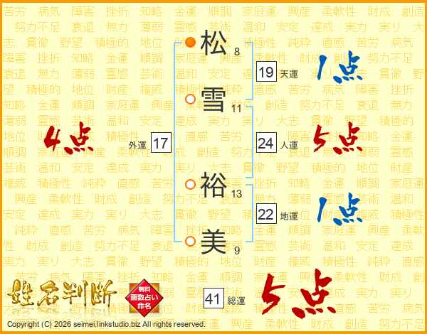 松(8画)雪(11画) 裕(13画)美(9画)