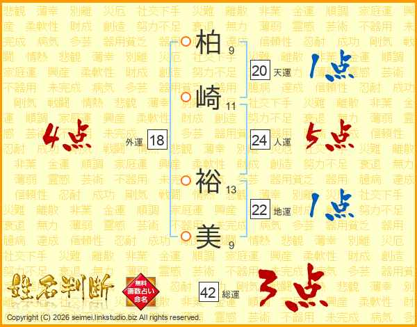 柏(9画)崎(11画) 裕(13画)美(9画)
