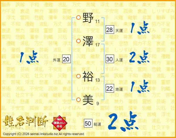 野(11画)澤(17画) 裕(13画)美(9画)
