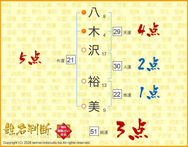 八(8画)木(4画)沢(17画) 裕(13画)美(9画)