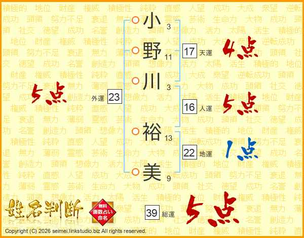 小野川裕美さんの総運は39画の5点!