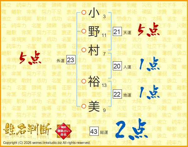 小(3画)野(11画)村(7画) 裕(13画)美(9画)
