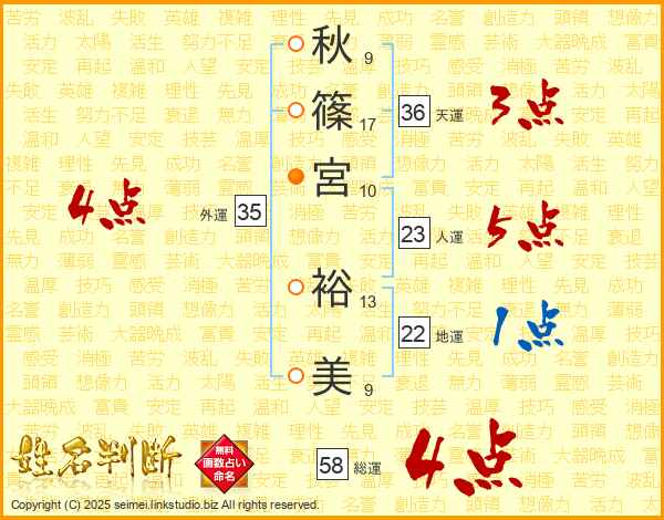 秋(9画)篠(17画)宮(10画) 裕(13画)美(9画)