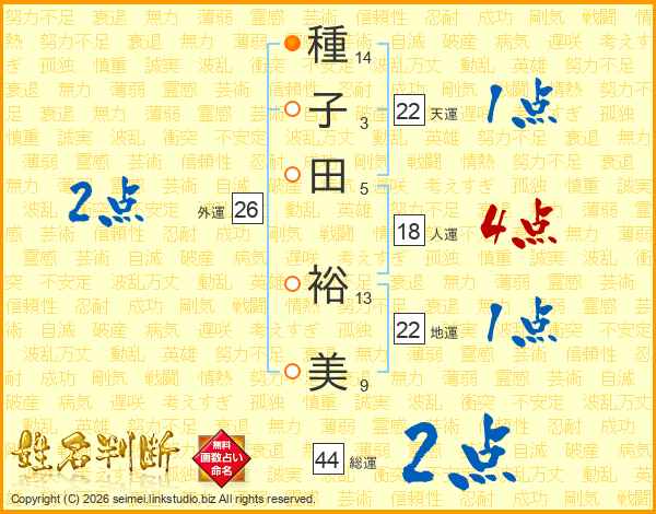 種子田裕美さんの総運は44画の2点!
