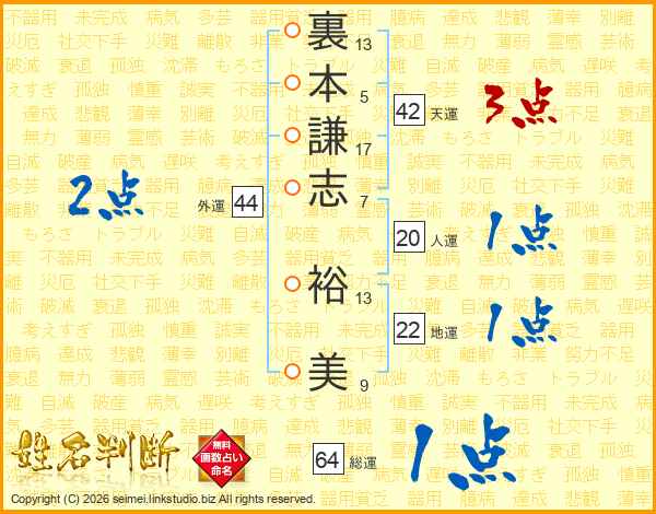 裏(13画)本(5画)謙(17画)志(7画) 裕(13画)美(9画)