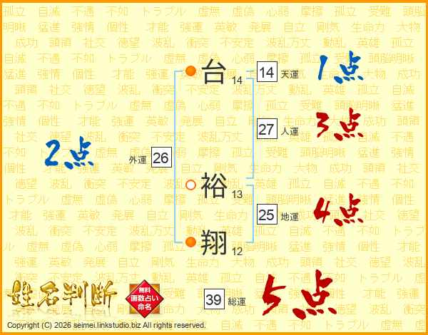 あなたの人生を表す1番重要な運勢です。生涯を通じて影響する総合運となり、主に50歳以降の晩年期に影響を及ぼします。苗字と名前の合計画数。