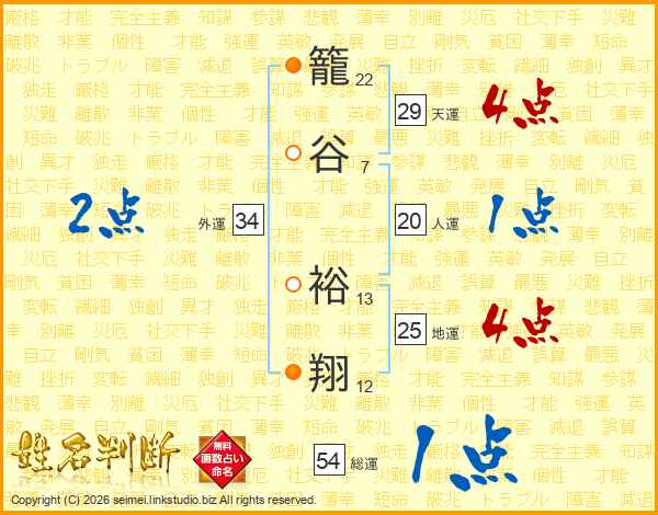 籠(22画)谷(7画) 裕(13画)翔(12画)