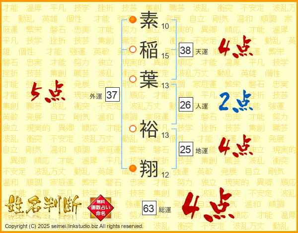 素(10画)稲(15画)葉(13画) 裕(13画)翔(12画)
