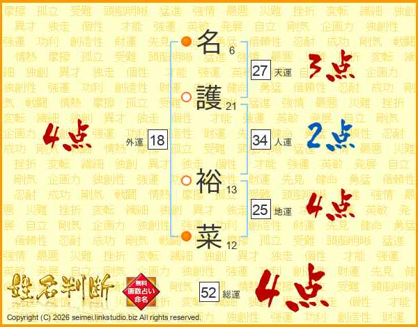 名(6画)護(21画) 裕(13画)菜(12画)