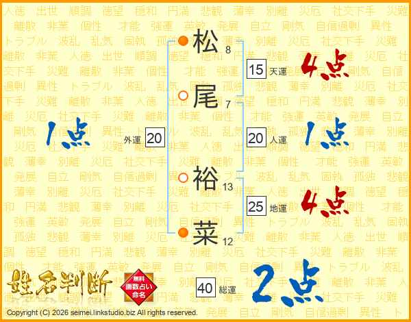 松(8画)尾(7画) 裕(13画)菜(12画)