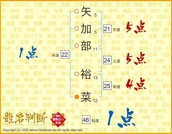矢(5画)加(5画)部(11画) 裕(13画)菜(12画)