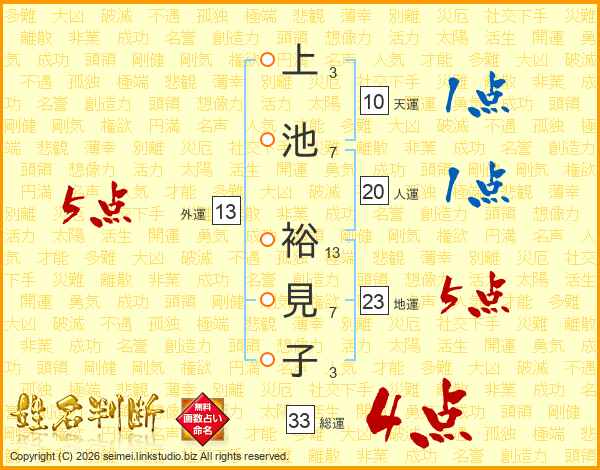 上(3画)池(7画) 裕(13画)見(7画)子(3画)
