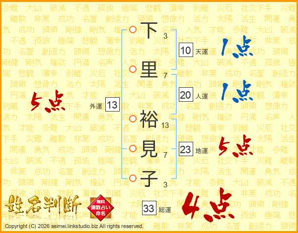下里裕見子さんの総運は33画の4点!