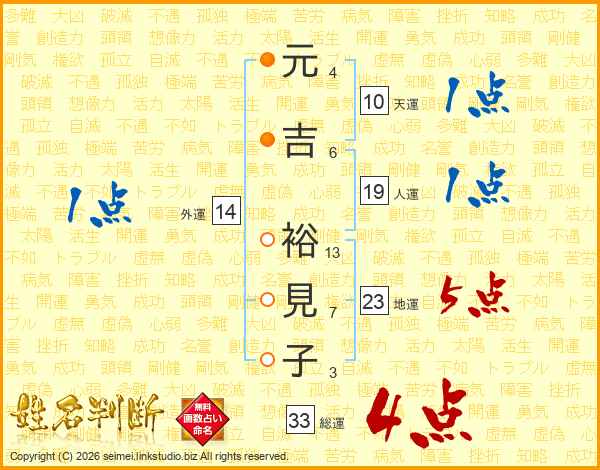 元(4画)吉(6画) 裕(13画)見(7画)子(3画)