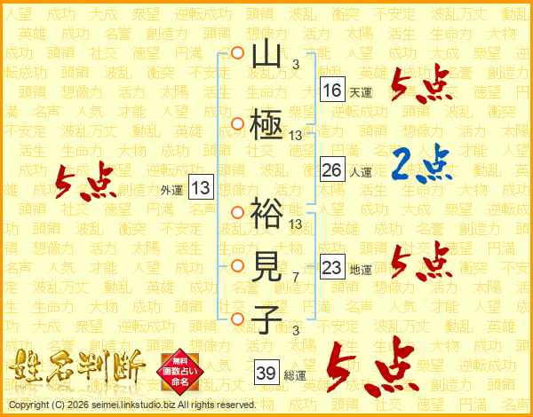 山(3画)極(13画) 裕(13画)見(7画)子(3画)