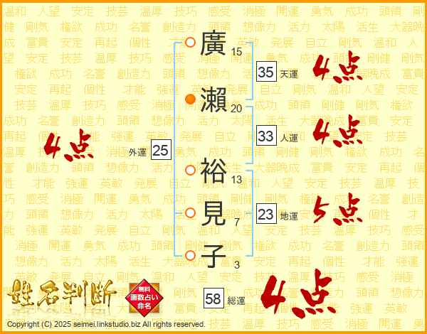 廣(15画)瀨(20画) 裕(13画)見(7画)子(3画)